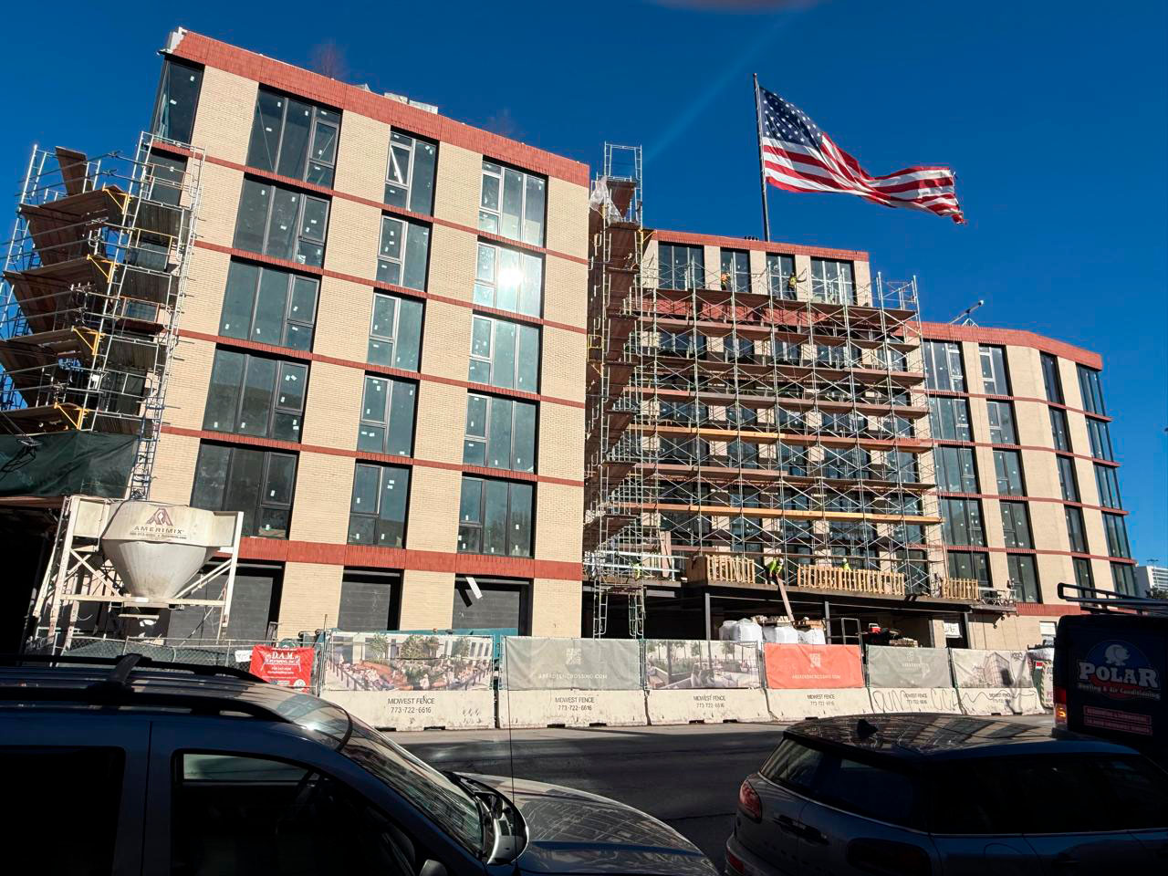 El edificio 1100 W Grand, diseñado por el estudio BKL Architecture y desarrollado por Wildwood Investments, es una edificación de siete niveles con uso principalmente residencial, que incluye 99 departamentos, estacionamiento, un área comercial y espacios comunes y amenities como un lobby y un rooftop.