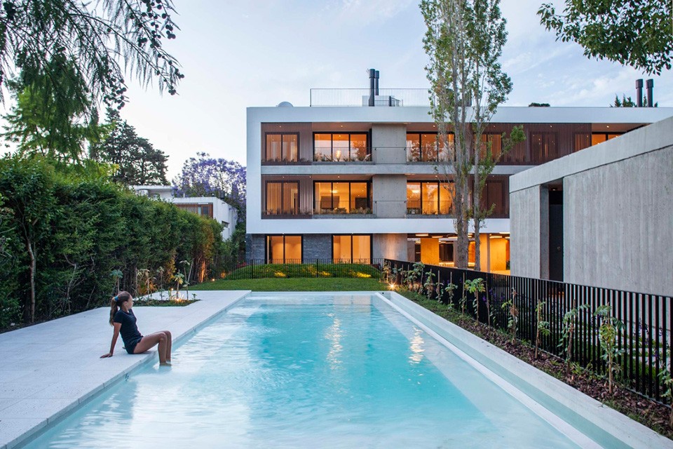 Este edificio multifamiliar está ubicado en City Bell, provincia de Buenos Aires. La premisa principal del proyecto es la de permanecer en constante vínculo con el entorno exterior inmediato y la vegetación predominante del lugar. El edificio posee dos bloques de unidades funcionales articuladas por un patio. El proyecto se sintetiza con la utilización de unos pocos materiales y texturas, donde se destaca el hormigón visto y la madera; donde las aberturas de PVC de paños fijos y doble contacto de la línea EFFICIENT junto a las corredizas de la línea  PRIME y la línea ADVANCE foliadas en color Jet Black, acompañan con estilo, tecnología y eficiencia al proyecto, potenciando el ingreso de la luz natural a cada uno de los ambientes.