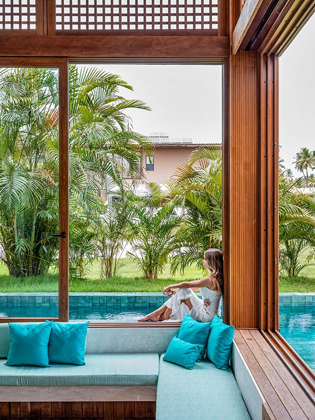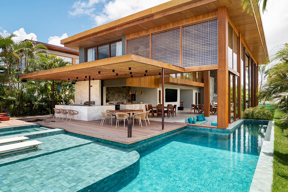 Vivienda prismática y compacta materializada con una combinación de texturas y materiales donde la conexión con la naturaleza y el entorno predominan en el proyecto. La piscina se relaciona con la vivienda a través de una pérgola que invita a disfrutar del espacio. Los grandes ventanales corredizos de la línea JUMBO foliados en Golden Oak, de piso a techo conectan visualmente el interior con el exterior y desmaterializan la fachada hacia la piscina. Al otro lado de la vivienda, la fachada es más bien ciega, intercalando madera y piedra con aberturas de PVC de la línea EFFICIENT y la línea JUMBO que permiten el ingreso de la luz natural y una gran integración con el entorno.