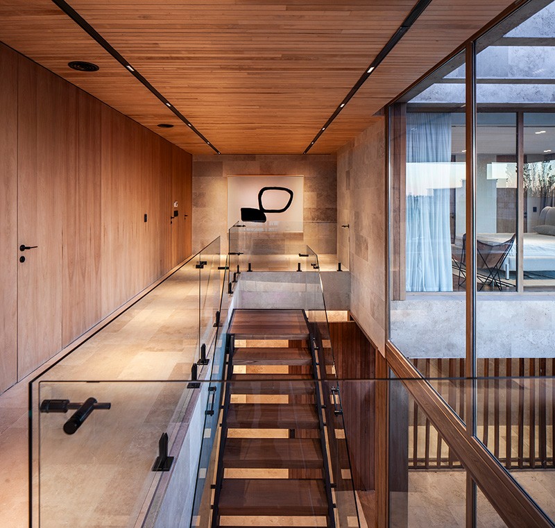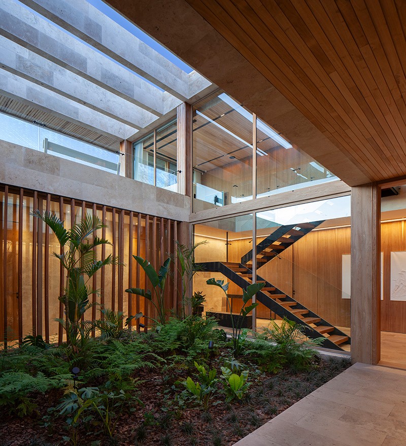 Es aquí donde el uso de grandes aberturas de la línea JUMBO y EFFICiENT foliadas en Turner Oak y su conjugación con elementos de arquitectura pasiva que se logra consolidar una impronta arquitectónica contemporánea con un espíritu sensorial que remite a la cultura oriental.
