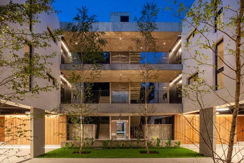 Este edificio multifamiliar está ubicado en City Bell, provincia de Buenos Aires. La premisa principal del proyecto es la de permanecer en constante vínculo con el entorno exterior inmediato y la vegetación predominante del lugar. El edificio posee dos bloques de unidades funcionales articuladas por un patio. El proyecto se sintetiza con la utilización de unos pocos materiales y texturas, donde se destaca el hormigón visto y la madera; donde las aberturas de PVC de paños fijos y doble contacto de la línea EFFICIENT junto a las corredizas de la línea  PRIME y la línea ADVANCE foliadas en color Jet Black, acompañan con estilo, tecnología y eficiencia al proyecto, potenciando el ingreso de la luz natural a cada uno de los ambientes.