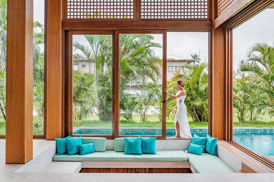Vivienda prismática y compacta materializada con una combinación de texturas y materiales donde la conexión con la naturaleza y el entorno predominan en el proyecto. La piscina se relaciona con la vivienda a través de una pérgola que invita a disfrutar del espacio. Los grandes ventanales corredizos de la línea JUMBO foliados en Golden Oak, de piso a techo conectan visualmente el interior con el exterior y desmaterializan la fachada hacia la piscina. Al otro lado de la vivienda, la fachada es más bien ciega, intercalando madera y piedra con aberturas de PVC de la línea EFFICIENT y la línea JUMBO que permiten el ingreso de la luz natural y una gran integración con el entorno.